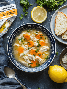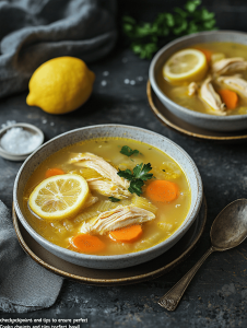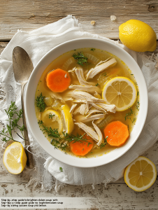 This bright and soothing chicken soup features tender chicken breasts simmered in savory broth, flavored with fresh lemon juice and zest for a refreshing tang. The soup has a clear, light appearance with a vibrant citrus aroma, balanced by hearty chicken and aromatic vegetables, offering a comforting yet invigorating bowl.