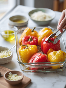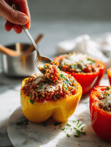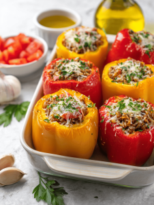 This dish features colorful bell peppers roasted until smoky and slightly caramelized, then filled with a flavorful mixture of ground meat or beans, cooked rice, tomatoes, and aromatic spices. The peppers are baked topped with melted cheese, resulting in a tender, slightly charred exterior and a hearty, gooey interior that’s both visually appealing and comforting.