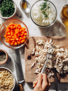 • Sharp chef’s knife: Chopping vegetables and shredding chicken.