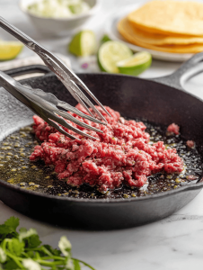 4. Stir the meat with tongs or a spoon, breaking it into smaller pieces, and cook until fully browned and cooked through, about 8-10 minutes. The meat should sizzle and release a savory aroma.