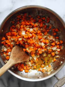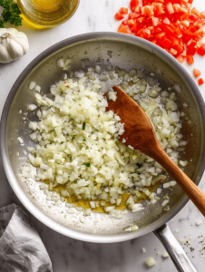 Step 2: Sauté chopped onions, carrots, and celery in a splash of oil until fragrant and translucent, about 8 minutes.