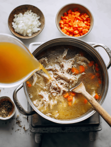 5. While the broth is hot, shred the chicken meat using two forks, removing bones and skin. Return the shredded chicken to the strained broth, stirring gently to combine.