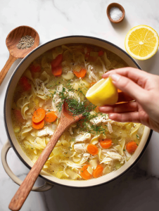 6. Season the soup generously with salt and freshly ground black pepper, then squeeze the juice of a lemon into the broth for brightness. Taste and adjust the seasoning as needed.