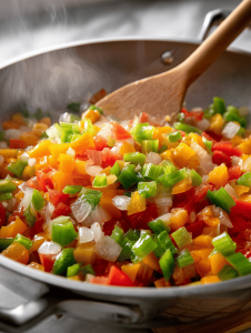Step 2: Heat oil over medium heat (about 160°C/320°F). Add diced onions, bell peppers, and celery. Sauté until fragrant and slightly softened, about 5 minutes.